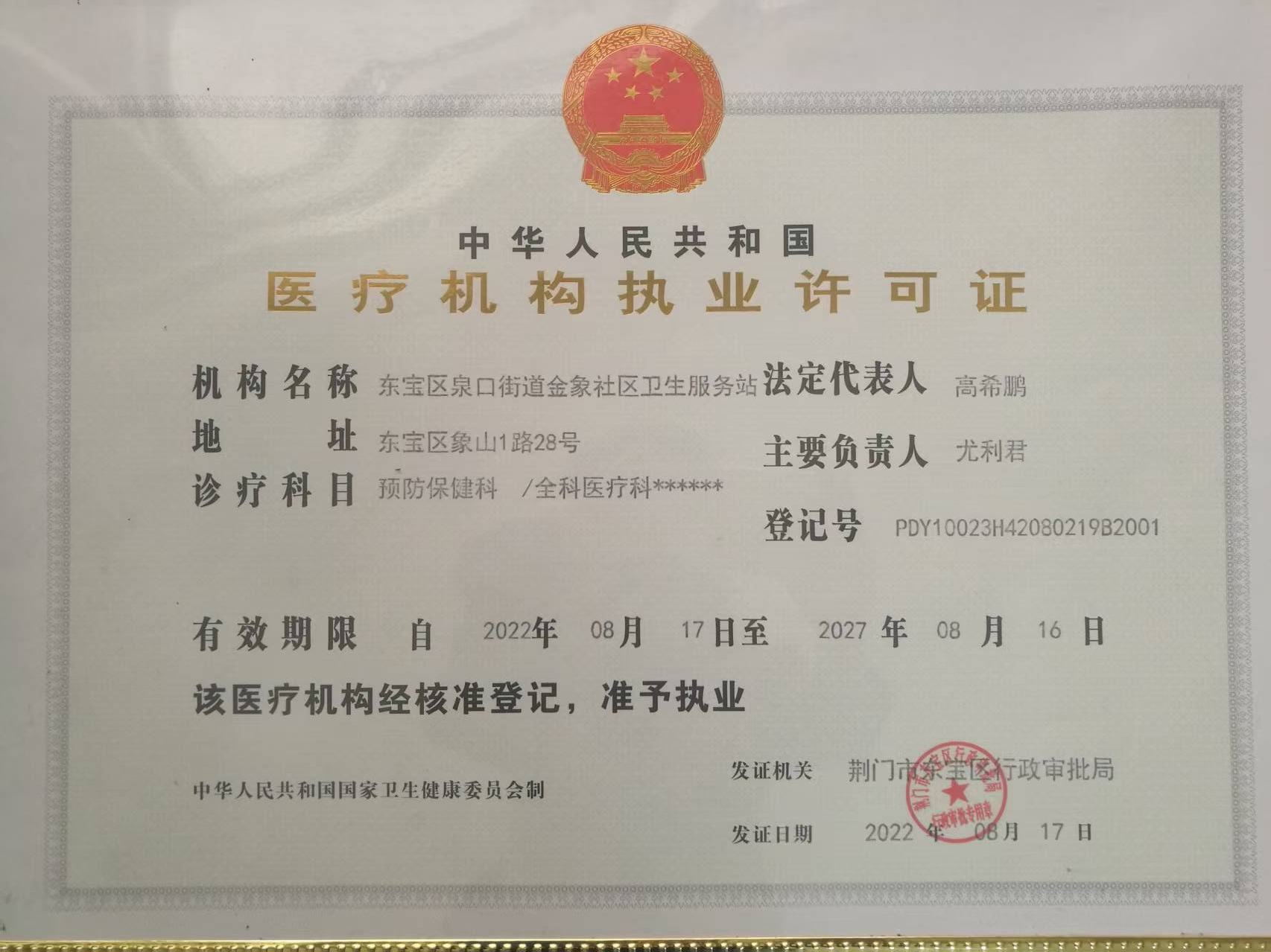 《中华人民共和国医疗机构执业许可证》机构名称:东宝区泉口街道金象社区卫生服务站,法定代表人:高希鹏;主要负责人:尤利君;诊疗科目:预防保健、全科医疗;经营性质:非营利性(非政府办);服务对象:社会。