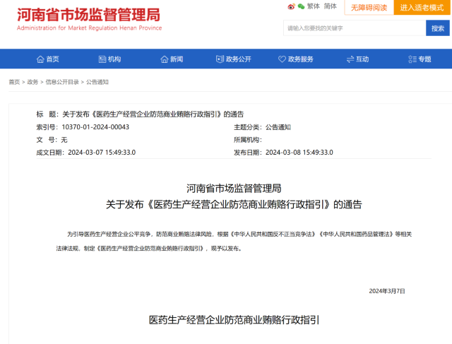 近期,河南省市场监督管理局发布《医药生产经营企业防范商业贿赂行政指引》(以下简称《指引》),依据相关法律规定,再次明确了商业贿赂行为及其行政处罚力度(河南省市场监督管理局网站,2024)。