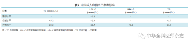 表2 中国成人血脂水平参考标准