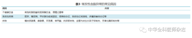 血脂异常是指血TC和/或TG水平升高,亦称为高脂血症。从临床实用角度出发可将其分为高TC血症、高TG血症和混合型高脂血症,以及低HDL-C血症。按病因分类,血脂异常包括原发性(遗传性)血脂异常和继发性血脂异常,前者包括家族性高胆固醇血症、家族性高TG血症(通常TG>10 mmol/L)等;后者通常指存在导致血清脂质和脂蛋白代谢改变的潜在疾病和代谢状态,常见病因见表3。