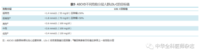 1.LDL-C是首要干预靶点:LDL-C每降低1 mmol/L,ASCVD风险下降约20%。因此,多数国家或地区的血脂管理指南均推荐将LDL-C作为降脂治疗的首要干预靶点。不同ASCVD危险分层的人群LDL-C降低的目标值不同(表5)。