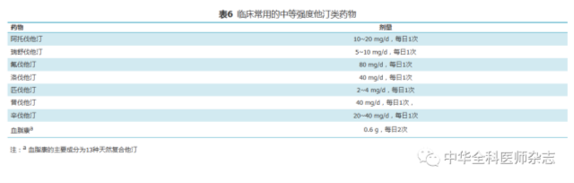 表6 临床常用的中等强度他汀类药物