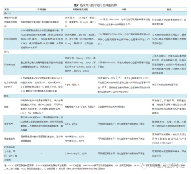 2.非他汀类降胆固醇和甘油三酯药物:除他汀类药物以外,还有多种药物可显著降低LDL-C水平,包括肠道胆固醇吸收抑制剂、PCSK9抑制剂等。降TG药物包括贝特类、高纯度ω3多不饱和脂肪酸制剂(ω3PUFA)等。非他汀类降胆固醇和甘油三酯药物的作用机制、常用剂量及疗效等详见表7。