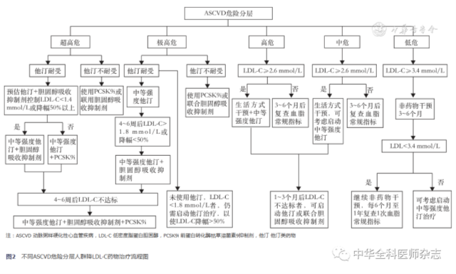 图2 不同ASCVD危险分层人群降LDL-C药物治疗流程图