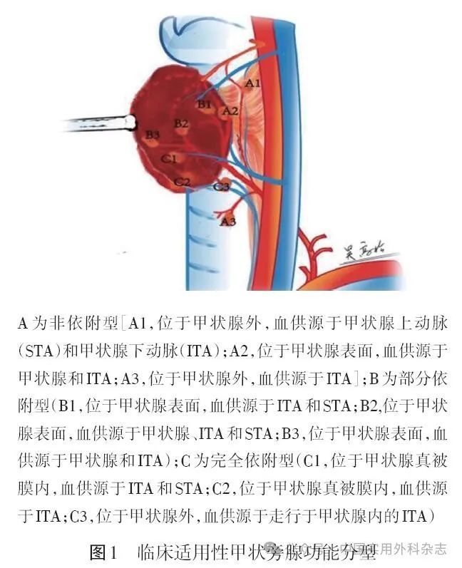 2.2 甲状旁腺分型 国际上已发表多种甲状旁解剖分型,有助于甲状旁腺功能保护。根据甲状旁腺与甲状腺的位置关系及原位保留的难易程度将甲状旁腺分为 A、B两型。A型为紧密型,即甲状旁腺与甲状腺的关系紧密、相对较难原位保留。B型为非紧密型,即甲状旁腺与甲状腺之间有自然间隙,比较容易原位保留。值得注意的是,甲状旁腺功能保护关键技术难点为术中保护其动静脉不被损伤,有研究依据甲状旁腺血供及回流与甲状腺的关系,提出临床适用性甲状旁腺功能分型(图1):(1)非依附型。甲状旁腺具有独立血供及回流,若不进行中央区淋巴结清扫不会受损,若进行清扫需小心辨别保护。(2)部分依附型。部分依赖于甲状腺的血供及回流,可尝试从远端分离并保留甲状旁腺的血管,对静脉回流受阻淤血的甲状旁腺需剪开解压,或行远端部分甲状旁腺种植。(3)完全依附型。完全依赖于甲状腺的血供及回流,术中需行甲状旁腺自体移植。这种“临床适用性甲状旁腺功能分型”可为甲状旁腺的功能保护提供解剖学依据及方法。