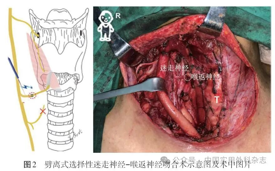 3.2 喉返神经损伤修复方法 术中发现肿瘤侵犯喉返神经时,需要将受累的喉返神经进行节段性切除。喉返神经具有支配声带的重要生理功能,节段性切除后的修复方式一直是困扰业界的世界性难题。喉返神经节段性切除后的修复方式很多,包括直接吻合术、游离神经移植术、颈袢-喉返神经吻合术、神经(肌蒂)埋植术等,但存在缝合张力大、吻合端距离长需要额外牺牲其他神经来进行移植或操作复杂等局限性,其中“劈离式选择性迷走神经-喉返神经吻合术”(图2),是一种简单且效果明确的喉返神经损伤吻合修复方法:在显微镜下修齐喉返神经远心端断端,显露喉返神经远心端神经纤维,术中用神经监测仪识别解剖游离迷走神经支配声带的运动支。观察喉返神经远心端及迷走神经支配声带的运动支,尽可能做到神经对位且无张力吻合,避免缝合时发生扭转,保证神经纤维被神经外膜完整包裹。该方法术后病人的声音嘶哑均在术后有不同程度的恢复。