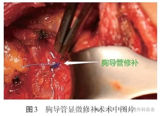 甲状腺手术损伤胸导管引起的乳糜漏可导致切口经久不愈,常见于左侧颈淋巴结清扫术后,因胸导管及其属支解剖变异,也可见于右侧颈淋巴结清扫及中央区淋巴结清扫术后。目前国内外普遍采用不解剖显露胸导管等被动规避性措施,因胸导管存在解剖变异,有时难以有效规避。胸导管意外损伤后,国内外普遍采用直接结扎胸导管等封堵策略。《甲状腺癌颈淋巴结清扫术后乳糜漏防治中国专家共识(2022版)》建议胸导管如有损伤应及时缝扎或夹闭。该方法可能因阻断了乳糜回流,引起胸导管管腔内压力剧增,进而在术后再次发生乳糜漏;且改变了乳糜正常回流途径,可能导致乳糜胸等严重并发症。借鉴大禹治水“改堵为疏”理念,有研究提出疏通策略,采用胸导管显微修补术(图3),对损伤的胸导管进行修补,既不增加胸导管管腔压力,又保证了乳糜液的正常回流路径。对术后已经发生乳糜漏的病人进行乳糜漏高、中、低流量分类,针对不同类型行个体化综合治疗,以加速胸导管愈合。低流量(≤50 mL/d)病人:正常饮食,局部加压包扎;中流量(50~500 mL/d)病人:高热量、高蛋白、低脂肪饮食,局部加压包扎;高流量(≥500 mL/d)病人:禁饮食,持续强负压吸引和引流,粘连剂注射,生长抑素类似物应用。