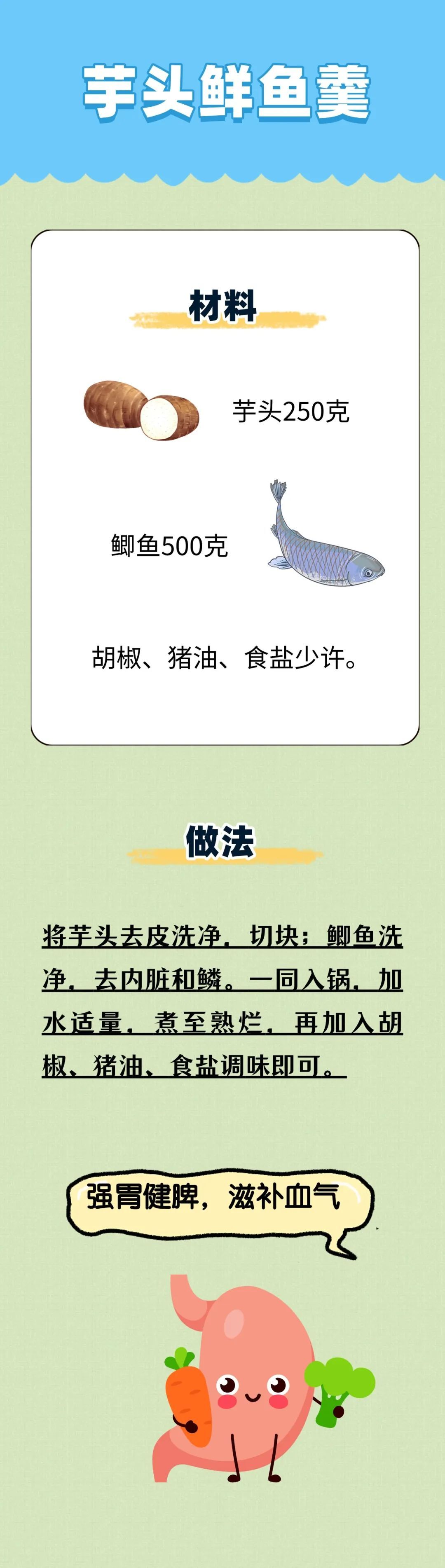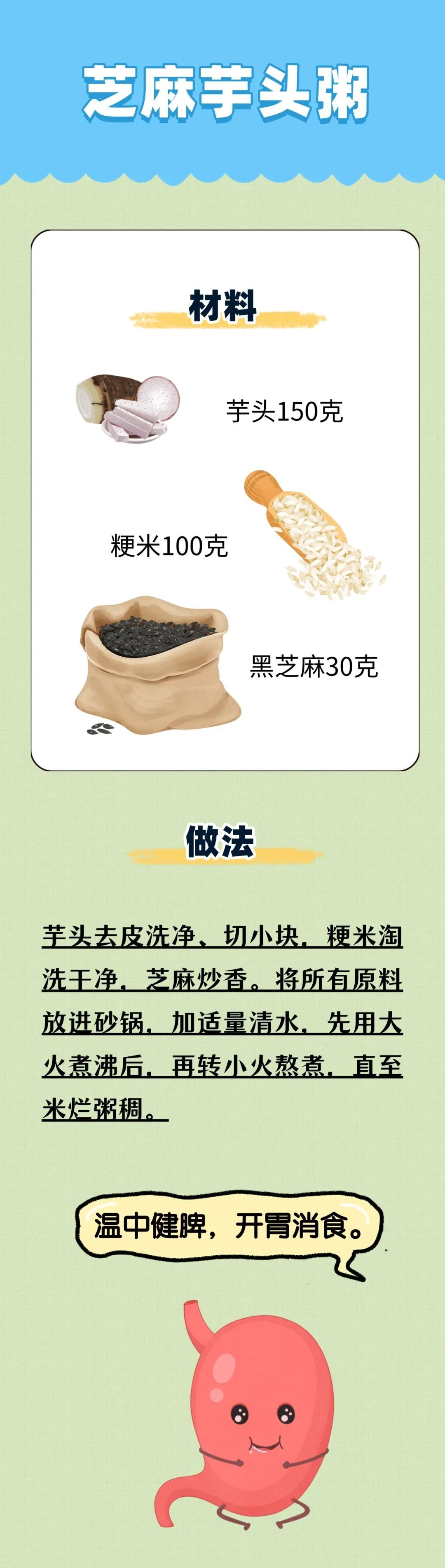 中医认为,芋头味甘、辛,性平,归胃经,有健脾补虚、散结解毒之功效,主脾胃虚弱、纳少乏力、消渴、瘰疬、肿毒、赘疣、疥癣、烫火伤。《滇南本草》说它“治中气不足,久服补肝肾,添精益髓”。《食疗本草》中提到芋头能“疗烦热,止渴,令人肥白,开胃,通肠闭”。《本草纲目》中还讲述了一个用芋头治伤的趣闻:隐居在王屋山的刘易,有天看到一只被蜂蜇伤的蜘蛛,肚子肿胀似要爆开,蜘蛛爬到芋头上,咬破芋梗,在芋梗上来回擦,不一会儿,肿胀竟然消失了。受此启发,人们学会了用芋头治伤消肿。