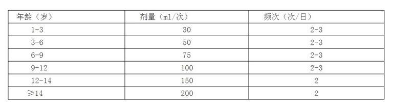 儿童剂量:1岁≤年龄≤3岁可用5ml或10ml注射器喂服,少量多次频服。