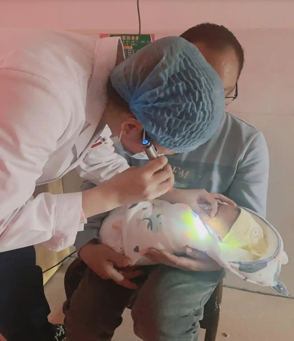 (图片:新田县妇幼保健院儿童保健科医务人员正在为出生的小宝宝进行新生儿听力筛查和致盲性眼病筛查。)