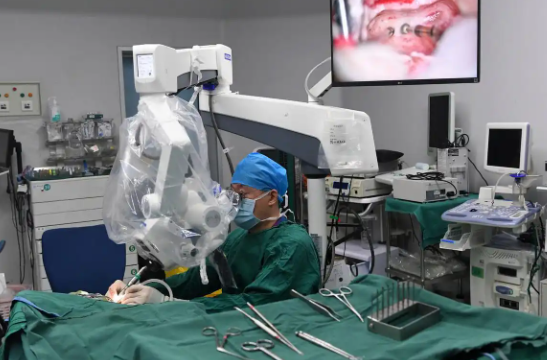 3月3日,在首都医科大学附属北京友谊医院,耳鼻咽喉头颈外科中心主任刘玉和为患者做人工耳蜗植入手术。新华社记者 马宁 摄