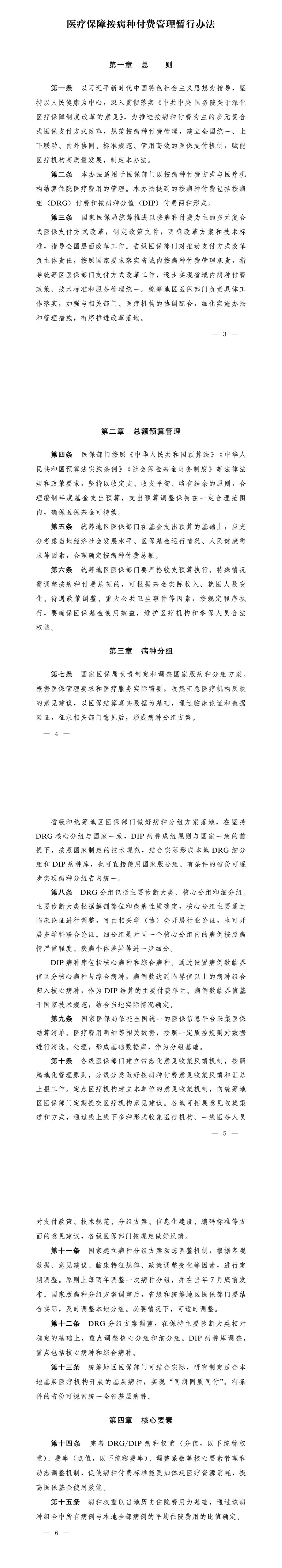 《办法》落实《中共中央 国务院关于深化医疗保障制度改革的意见》要求,以按病种付费为重点全面推进医保支付方式改革,目的是建立全国统一、上下联动、内外协同、标准规范、管用高效的医保支付机制,赋能医疗机构高质量发展。《办法》的基本架构共八章三十九条,对按病种付费有关政策、关键技术、核心要素、配套措施等进行了明确,突出了三个方面的规范:一是规范总额预算管理,要求合理编制支出预算,在此基础上确定按病种付费总额,强调总额预算的刚性。二是规范分组方案制定和调整。明确分组方案的制定主体、分组框架、数据和意见支撑、调整内容等,原则上要求分组方案两年调整一次。三是规范核心要素和配套措施。厘清了权重、费率、支付标准等内涵,要求核心要素确定中医保部门要与医疗机构充分协商,达成一致。规范医保支付相关的配套措施,包括特例单议、预付金、意见收集、谈判协商和医保数据发布等,提高医保支付的科学水平。《办法》还明确将按病种付费相关要求纳入协议管理,加强改革成效监测评估,强化基金监管,完善医保信息平台建设等,提升按病种付费的标准化水平。