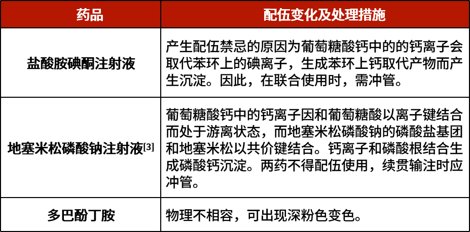 另外,根据《临床静脉用药调配方法与配伍禁忌速查手册》第2版[2],葡萄糖酸钙注射液还与心内科常用药品氨力农、肾上腺素、维拉帕米、氨茶碱及呋塞米皆存在配伍禁忌,建议与上述药品序贯输注时应冲管。