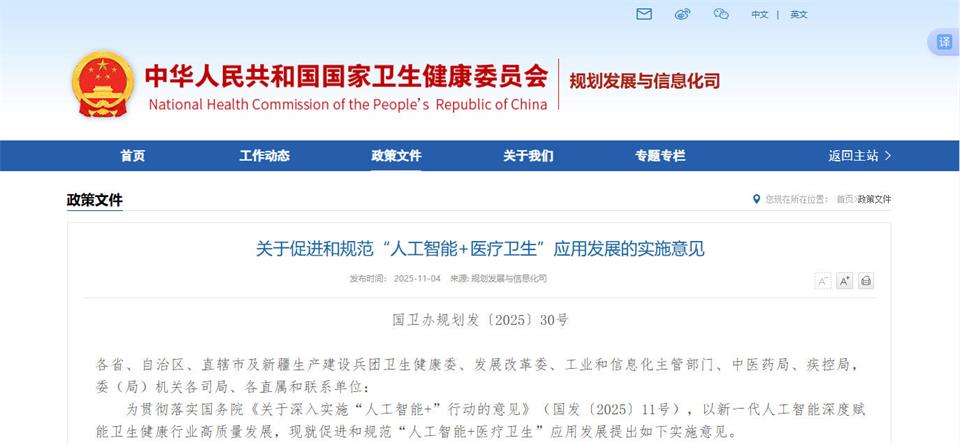 为贯彻落实国务院《关于深入实施“人工智能+”行动的意见》(国发〔2025〕11号),以新一代人工智能深度赋能卫生健康行业高质量发展,现就促进和规范“人工智能+医疗卫生”应用发展提出如下实施意见。