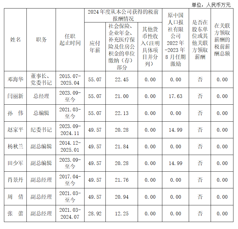 健康报社有限公司2024年度企业负责人薪酬情况