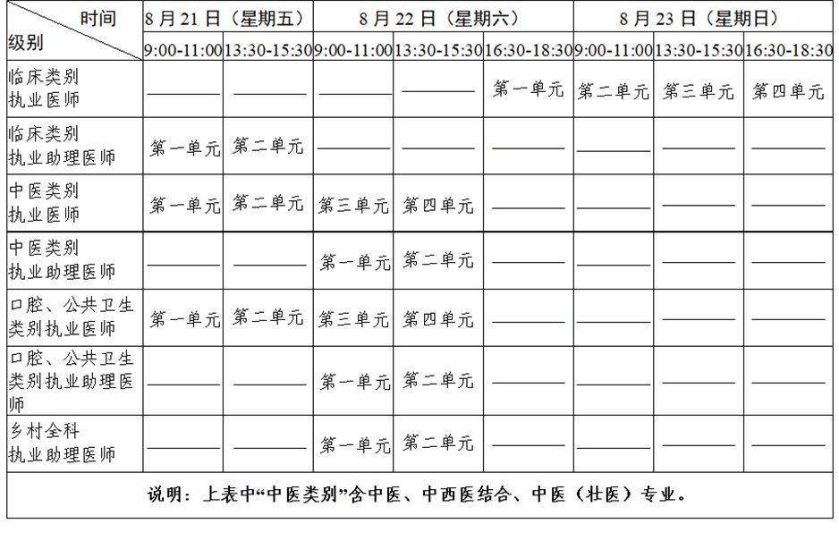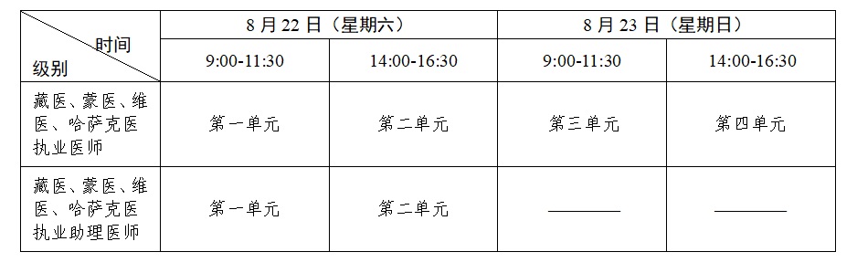 考试实行计算机化考试,军队现役人员、文职人员加试军事医学,院前急救岗位和儿科专业加试相应内容。中医类别藏医、蒙医、维医、哈萨克医专业实行纸笔考试。统一考试时间如下: