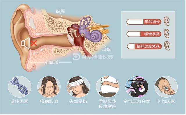 •2.疾病影响:腮腺炎、流感、中耳炎、脑膜炎、糖尿病,此外煤气中毒、噪音、出生时缺氧等因素也能导致耳聋。